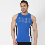 Blue Colour blocked innerwear vest has white and black typography detail, has a round neck and sleeveless